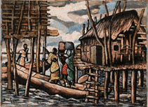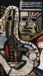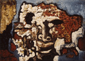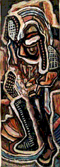 Mit Ghana begann für Aniambossou eineZeit des Reisens. Er besuchte viele afrikanische und europäischeLänder, unter anderem Nigeria, Kamerun, Gabon, Deutschland,Frankreich und Großbritannien. Er verbesserte seine Technik undentwickelte einen feinen Sinn für Farben und Formen. Anfang der80er Jahre intensivierte Aniambossou die Suche nach einem eigenenStil. Es vergingen jedoch noch 10 Jahre des Studiums, bis seinebedeutendsten Kunstwerke entstanden: Die "Visages Tourmentés",die seinen Ruf als gefeierten zeitgenössischen Malerbegründeten. Im Jahre 1989 wurden Aniambossous Bilder in dieSammlung der Galerie Michèle Heyraud in Paris aufgenommen.Dort und an vielen anderen Ausstellungsorten üben sie immerwieder eine magische Faszination auf den Betrachter aus.