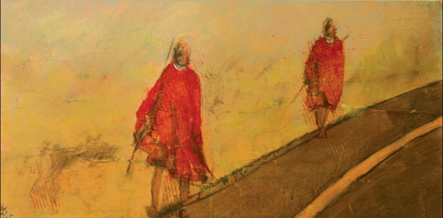 Dass das Nomadische von uns Sesshaften lediglich als etwas flüchtig Vorüberziehendes wahrgenommen wird, das wir allenfalls als Touristen oder als Film –und TV-Konsumenten zu registrieren imstande sind, lässt uns die Künstlerin erfahren , indem sie ihre Massai- Figuren szenenhaft auftauchen lässt als rot- gewandete Zeichen in undefinierter Landschaft. Gesichtslos stehen uns die unterschiedlichen Alters gegenüber und sind damit ebenso präsent wie sie uns in ihrem beschwerlichen Leben fremd bleiben. In manchen Bildern sind die Abdrücke von Schuh- bzw .Fußspuren basierend auf dem ornamenthatften Muster von Autoreifen zu entdecken – always on the road sind also auch die Massai…Anmut und Armut erhalten hier eine einleuchtende Versinnlichung in einem künstlerischen Bild .