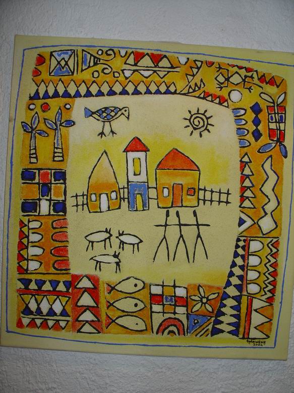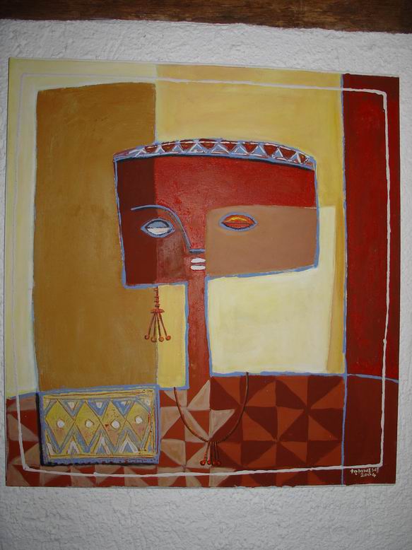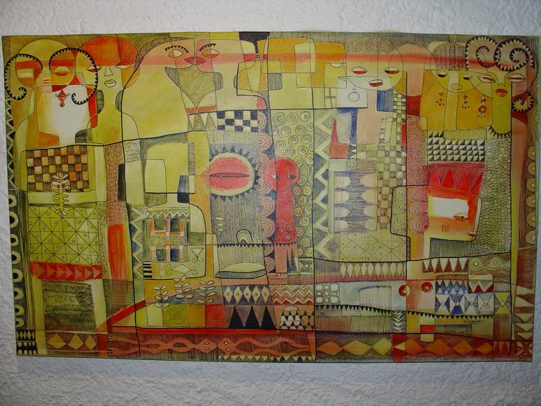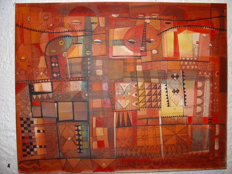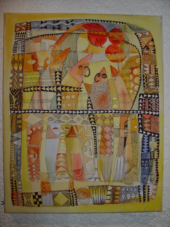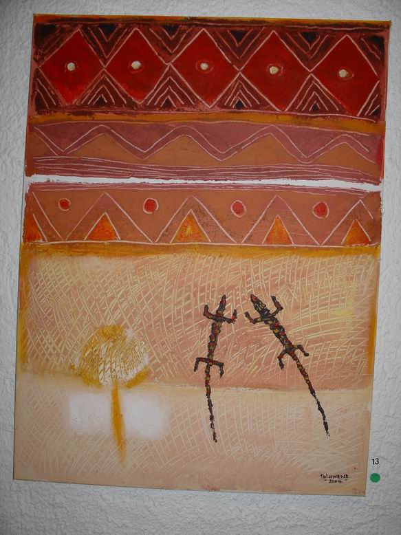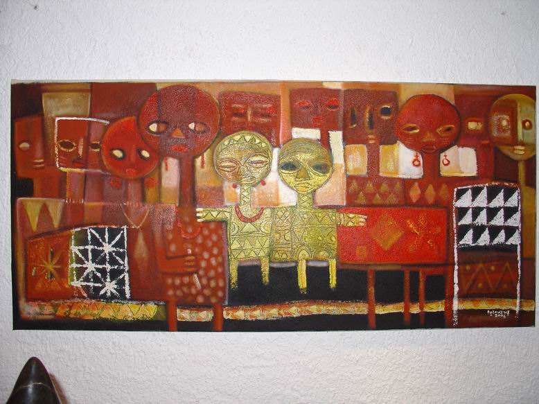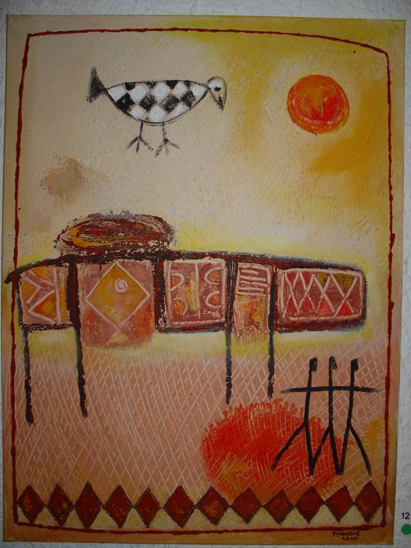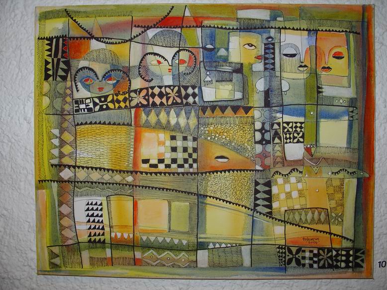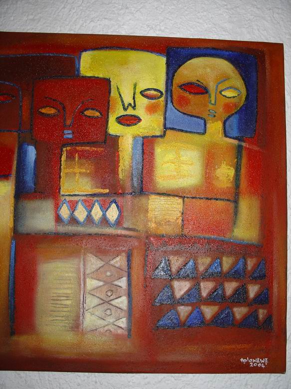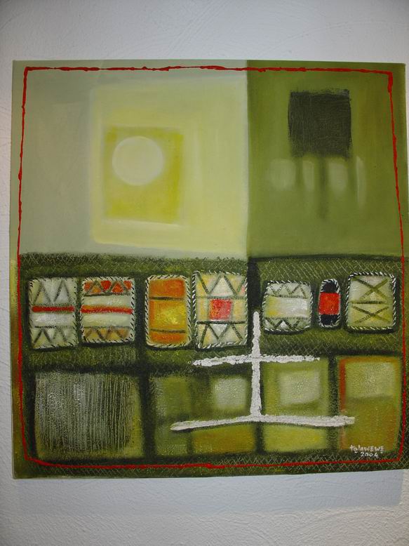 Der Maler Tola Wewe aus Nigeria bildet mit seinen neuen Bildern einen zweiten Ausstellungsschwerpunkt. Gemäß der Einsicht Picassos, "ein Leben lang zu brauchen, um wie ein Kind malen zu können", bevorzugt Wewe einen narrativen Malstil, der viele kleine Bildinformationen additiv in ein Bild packt und zu farbenfrohen ornamentalen Strukturen zusammenfügt. 1988 gründete er die Gruppe ONA-YORUBA (Kunst, Dekoration, Ästhetik…) mit dem Ziel, u.a. Kunst ‚fühlbar' zu machen, Gegenständliches gegen Abstraktes zu setzen, kindliche Formen und deren Unvoreingenommenheit in der Werteskala zu übernehmen. Motive aus nigerianischen Kindermärchen mit fabelähnlichem Charakter lassen auch Tiermotive anklingen. Damit entsteht eine direkte Verbindung zum Ausstellungsschwerpunkt Shona-Tiere.