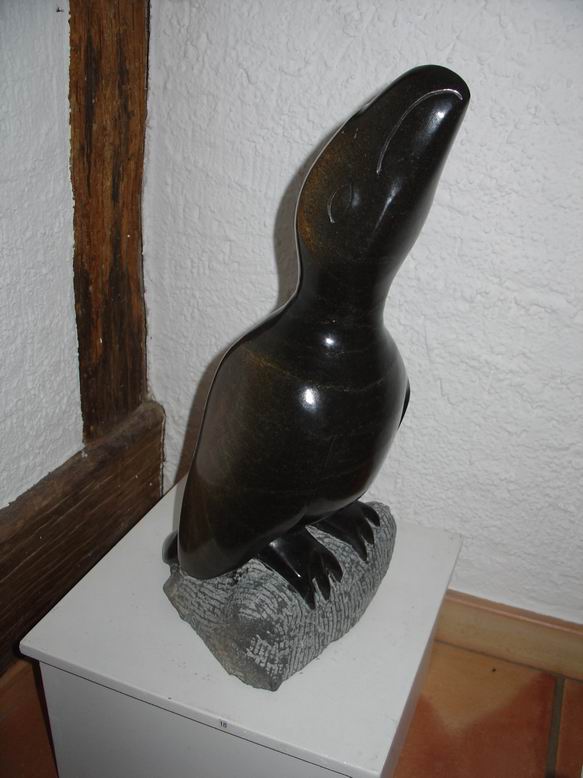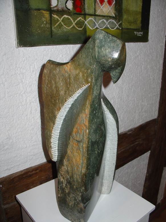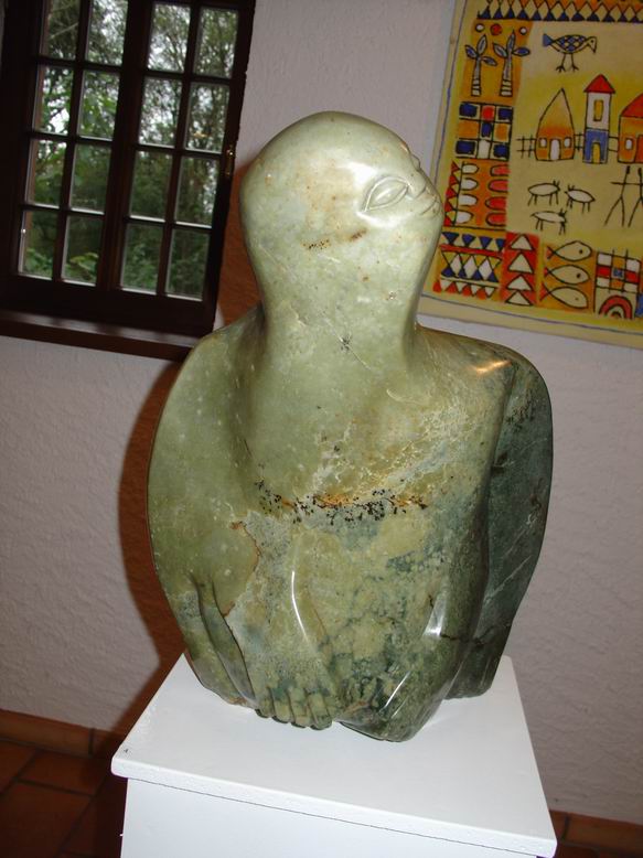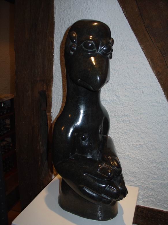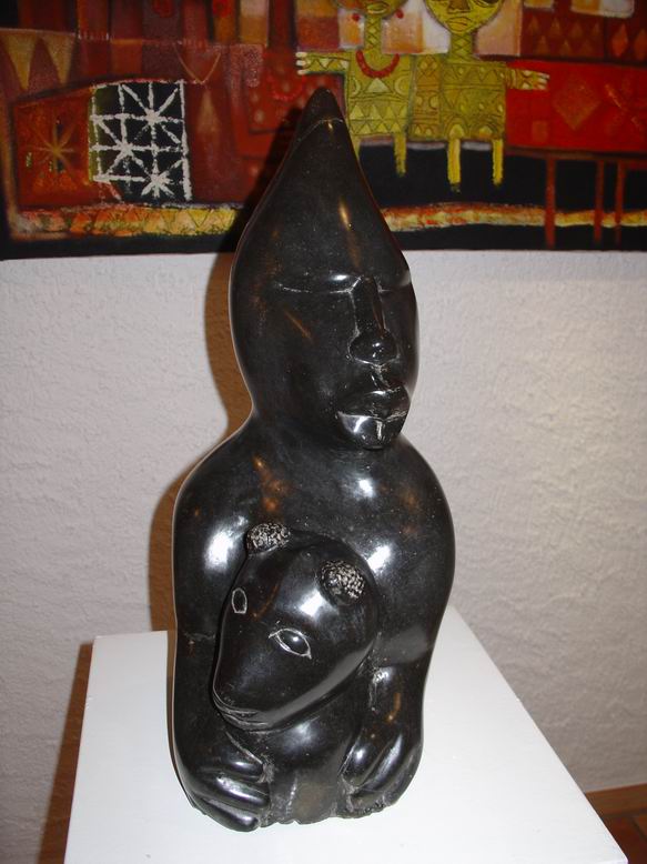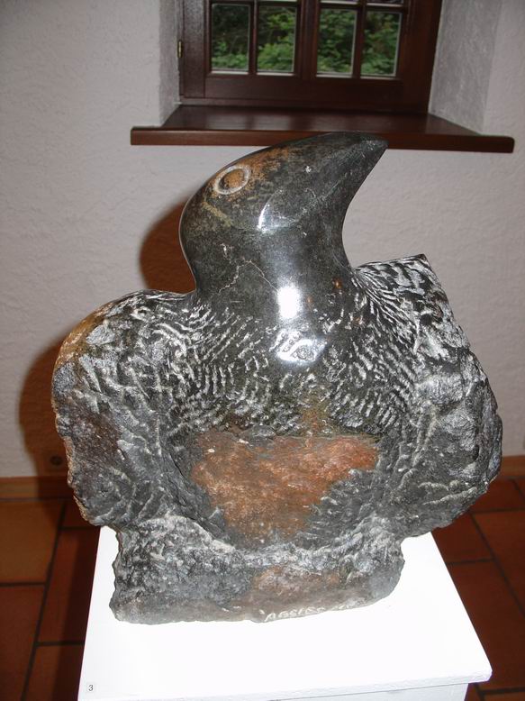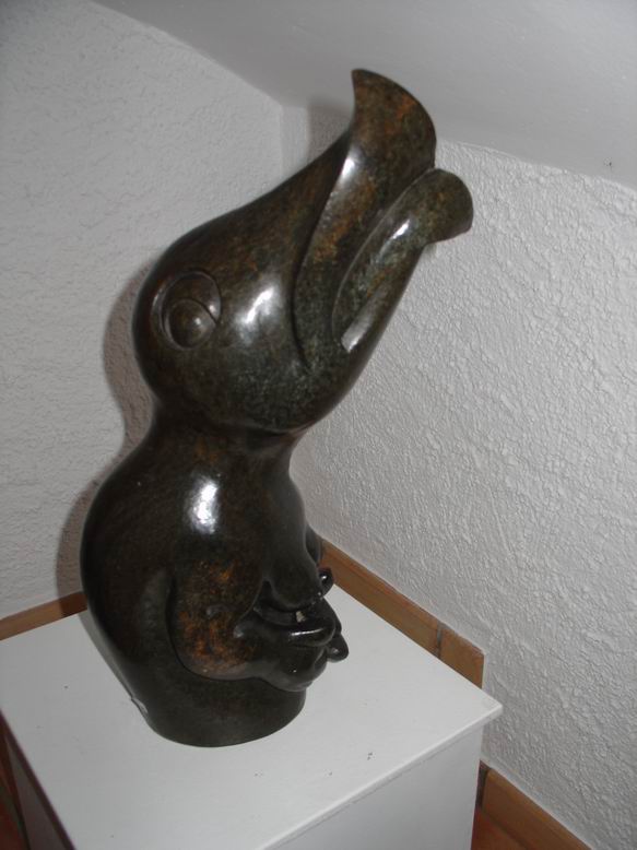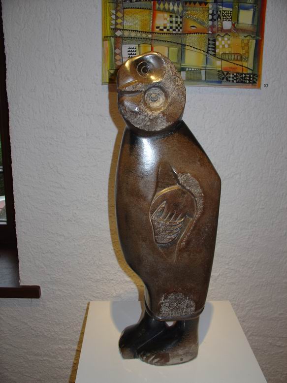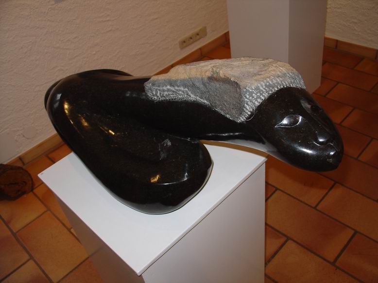 In der neuen Ausstellung der Bettendorffschen Galerie werden Shona-Tierskulpturen aus Simbabwe sowie neue Bilder des Malers Tola Wewe ausgestellt. Mit dem Begriff ‚Shona' wird die größte Bevölkerungsgruppe Simbabwes bezeichnet. Als junge Künstlerbewegung ist die Shona-Bildhauerei Ende der 50er Jahre entstanden und hat sich in der Gegenwart als eine der jüngsten Entwicklungen der internationalen Kunstszene etabliert. Überlieferungen alter Mythen und Legenden bilden die Grundlage künstlerischer Inspiration. Ein Geister- und Ahnenglaube liefert dabei den Stoff für Gestaltfindungen, die das Unsichtbare einer Gefühls- und Vorstellungswelt sichtbar werden lässt in Figuren mit expressiver Wirkung. Jeder ‚Shona' sieht sich unter dem Einfluss eines bestimmten Geistes, der ihm durchaus in erster Linie nützliche Eigenschaften bringt. Im Durchleben mehrerer Metamorphosen werden dem Menschen auch gleichzeitig mehrere Identitäten zugeordnet, was sich in einer Skulptur sowohl in Mensch-Tierkombinationen als auch in kubistisch anmutender Mehrperspektivität zeigen kann. Ein Gesicht kann also ‚tierisch-menschlich' wirken und dabei noch in verschiedene Richtungen blicken. Die bei der neusten Ausstellung der Bettendorffschen Galerie ausgesuchten Tierskulpturen entstanden sicherlich vor dem Hintergund des sozialen Umbruchs durch Bürgerkriege, der Unabhängigkeit des ehemaligen Rhodesiens und missionarischer Einflüsse. Umso erstaunlicher ist die unkomplizierte, direkte Wirkung der Skulpturen, die ihre Expressivität auch in humorvoller Spannung und Ironie entwickeln. Auch ohne das Wissen um Mythen und Legenden ziehen sie den Betrachter in ihren Bann und lassen eigene ‚Geschichten' entstehen.